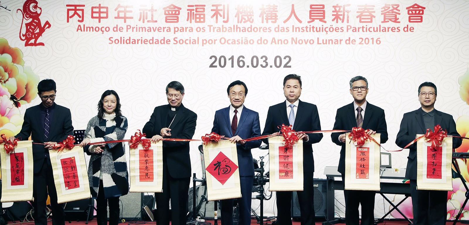 社會工作局假萬豪軒舉行「丙申年社會福利機構人員新春餐會」,邀請社會文化司司長譚俊榮、中聯辦副秘書長兼社會工作部部長黃華蓋、天主教澳門教區公署李斌生主教、社會文化司司長辦公室主任葉炳權及多位顧問,包括何麗鑽、惠程勇、羅奕龍和林曉白、勞工事務局局長黃志雄、房屋局局長山禮度、社會保障基金行政管理委員會主席容光耀、澳門生産力暨科技轉移中心理事長孫家雄等部門代表,以及本澳社會福利機構代表、社工局同工和傳媒朋友共近500多人出席,歡慶新春。