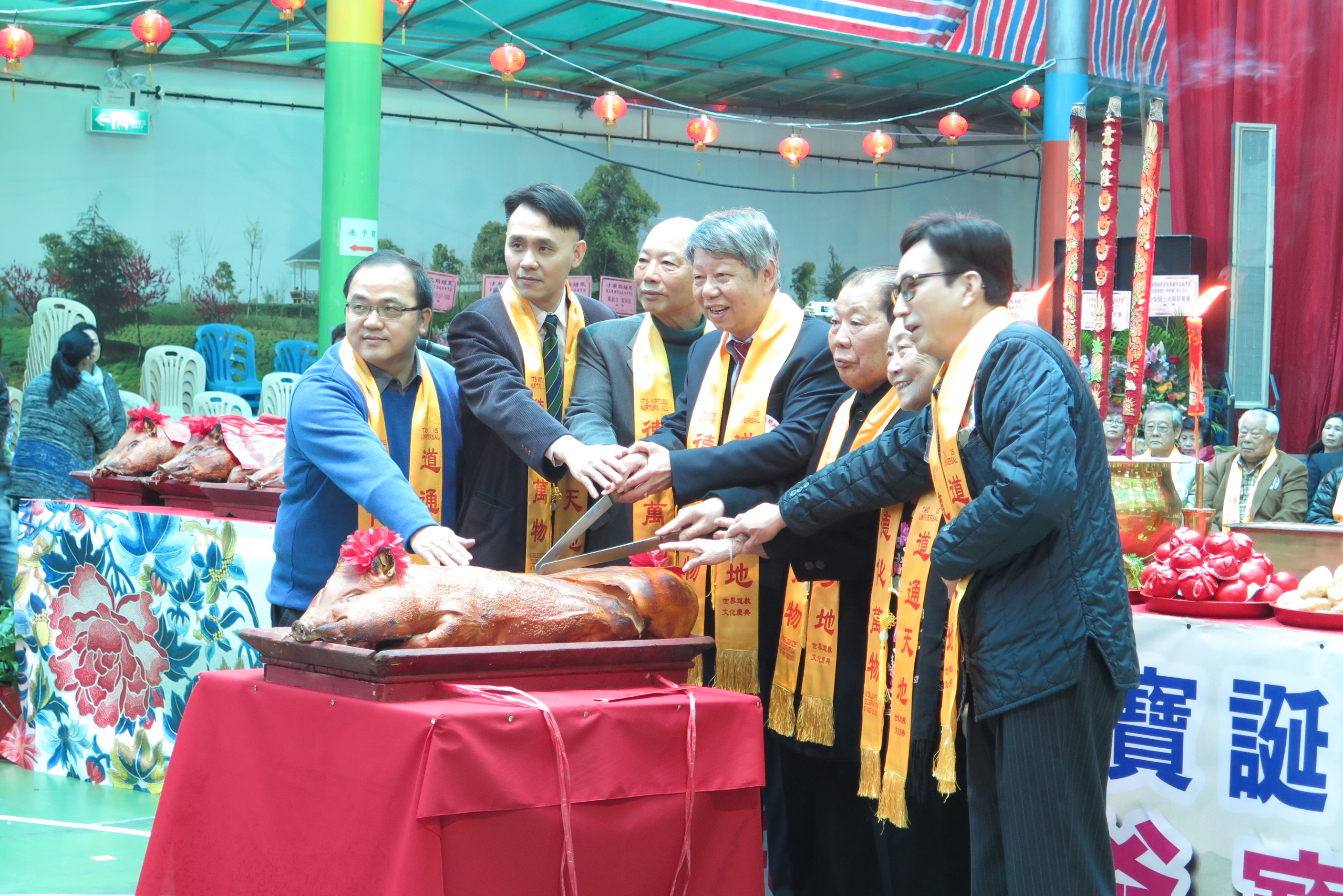 沙梨頭賀誕活動負責人主持切燒豬儀式