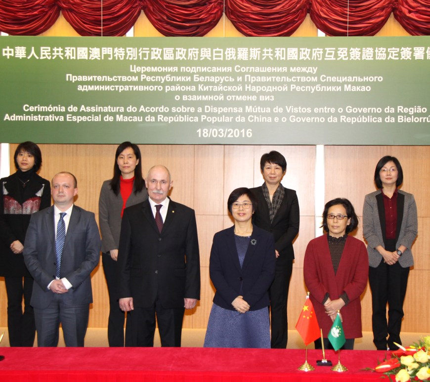 《中華人民共和國澳門特別行政區政府與白俄羅斯共和國政府互免簽證協定》的簽署儀式於2016年3月18日在澳門特別行政區政府總部舉行。