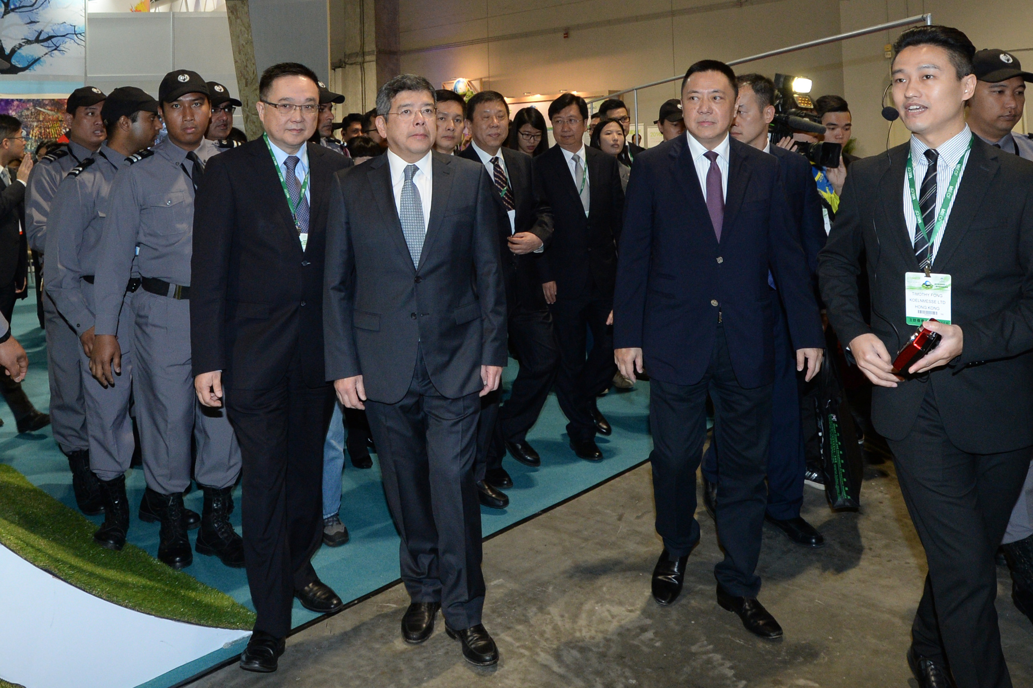 經濟財政司司長梁維特和運輸工務司司長羅立文參觀“2016澳門國際環保合作發展論壇及展覽”(MIECF)展覽場館