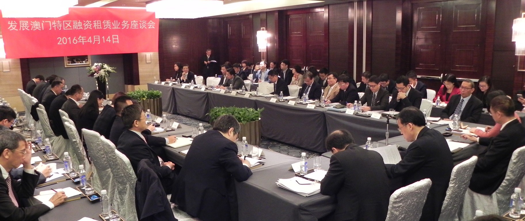 為落實特區政府發展特色金融的施政方針、推動澳門融資租賃業務的發展,在中央人民政府駐澳門特別行政區聯絡辦公室(中聯辦)的鼎力支持以及澳門銀行公會主席行(即中國銀行澳門分行)的協助下,澳門金融管理局在2016年4月14日於北京舉辦了“發展澳門特區融資租賃業務座談會”。中聯辦姚堅副主任、中國銀行業監督管理委員會(中國銀監會)國際部方立明副主任以及財政局、貿促局的代表出席了座談會。參會嘉賓包括國家開發銀行、中國外商投資企業協會租賃業工作委員會、澳門銀行公會、澳門保險公會、內地和澳門的主要融資租賃企業的代表等。
