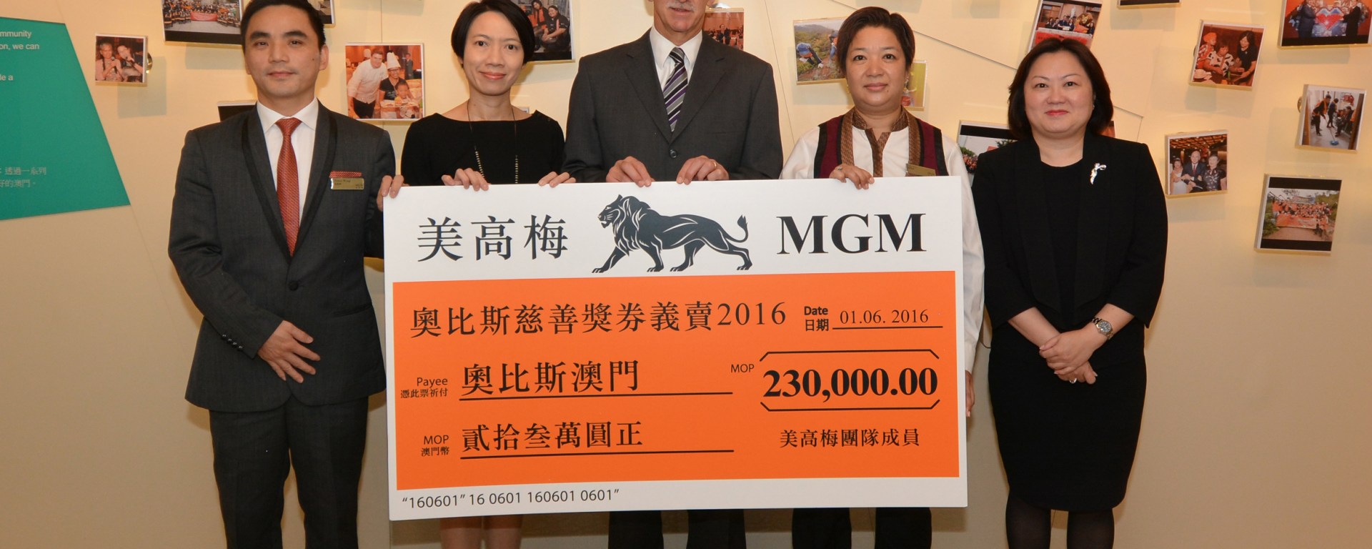 美高梅連續第八年參與由奧比斯澳門舉辦的「奧比斯慈善獎券義賣活動」,在金獅團隊的慷慨支持下,為奧比斯籌得合共澳門幣230,000元兒童救盲經費,再次成為捐款額最高之機構,為社會慈善業務出一分力。