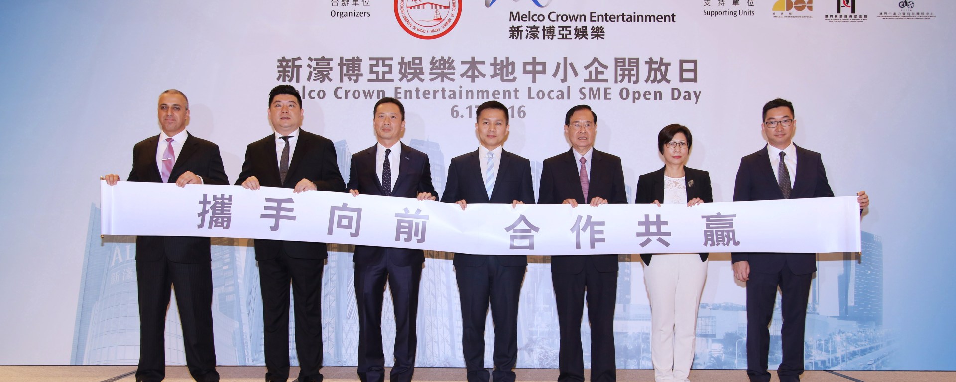 出席新濠博亞娛樂本地中小企開放日的主禮嘉賓包括:經濟財政司司長代表、經濟局局長戴建業;中華總商會副理事長崔煜林;新濠博亞娛樂營運總裁陳應達、高級顧問黃昇雄及供應鏈部副總裁Frank Alessio;生產力暨科技轉移中心副理事長莫苑梨;以及貿易投資促進局投資者服務廳高級經理黃偉倫。