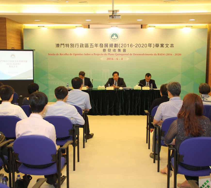 《澳門特區五年發展規劃(2016-2020年)草案文本》於4月26日公佈並展開為期兩個月的意見收集工作。五年發展規劃是未來五年特區經濟社會發展的總體藍圖,是政府與廣大居民共同努力的行動綱領。在編制過程中,得到國家發展和改革委員會規劃司、清華大學和澳門理工學院幾個顧問團隊的義務指導。
