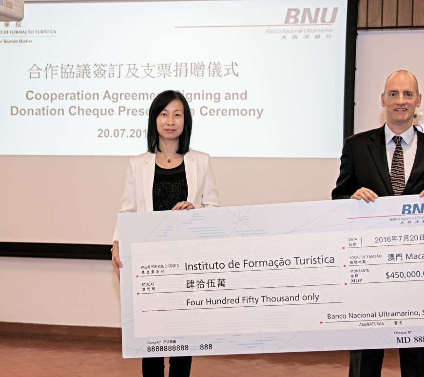 大西洋銀行捐出澳門幣四十五萬元予旅遊學院作獎學金,捐贈儀式由旅遊學院院長黃竹君博士及大西洋銀行行政總裁郭冠樑先生主持。
