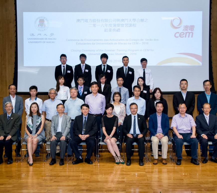 澳門大學(澳大)與澳門電力股份有限公司(澳電)的暑期實習課程結業典禮於九月底假澳大橫琴校園學生活動中心劇場舉行。澳大各學院教授及澳電各部門代表應邀出席,並由澳大科技學院處理院長王百鍵及澳電通訊及公共事務辦公室高級經理聶麗冰向十一名實習生頒發證書以讚揚同學們實習時的熱誠和貢獻。