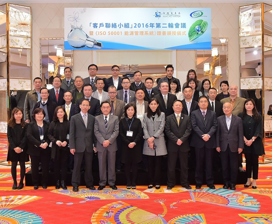 澳門自來水第八屆「客戶聯絡小組」二零一六年第二輪會議,於十二月十五日 (星期四) 假路氹城永利皇宮酒店一樓蓮花廳舉行。海事及水務局黃穗文局長、資源管理廳黃文濤廳長、澳門自來水執行董事關小冰、客戶聯絡小組主席朱偉文、副主席覃伯德,以及一眾小組成員出席是次會議。是次報告內容包括:本澳用水量分析結果簡介、澳門自來水最新電子服務平台介紹、內地對澳供水的最新狀況及相關工程進度簡介、客戶支持度調查2016結果簡介及澳門自來水獲取《 ISO 50001 能源管理系統》證書介紹暨頒授儀式。