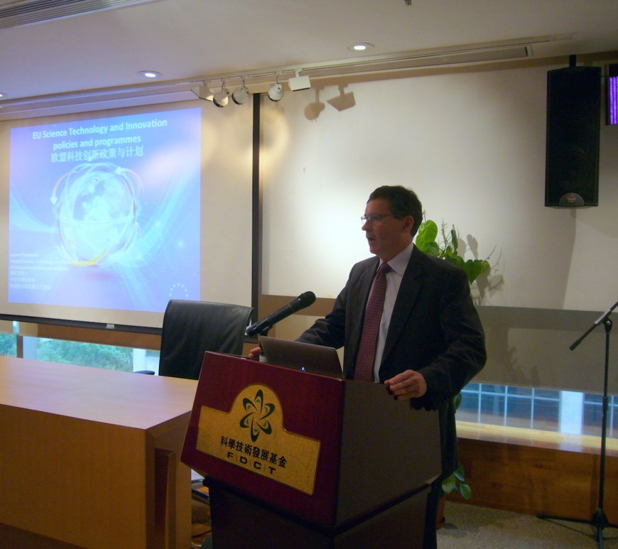 歐盟駐華代表團科技參贊薄思睿(Laurent Bochereau)、法國駐港澳總領事館科技專責小組代表Frederic Bretar及歐盟駐港澳辦事處經濟顧問鍾慧芬(Patricia Chung)於11月25日訪問科學技術發展基金,並在科技基金演講廳舉行了「歐盟地平線2020計劃簡介會」。 科技基金行政委員會委員鄭冠偉、科技顧問劉良鋼、高級經理朱奕敏等會見來賓,並出席簡介會。