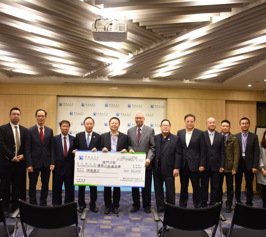 澳門自來水多年來為全澳巿民提供優質安全的食水,同時亦秉持「取於斯,用於斯」的理念,積極肩負社會公益責任。日前澳門自來水分別向澳門日報讀者公益基金會以及澳門同善堂捐贈善款支票;亦將一如既往於十二月十一日組織員工身體力行,支持一年一度的「公益金百萬行」,以點滴綿力,潤澤各階層的巿民。