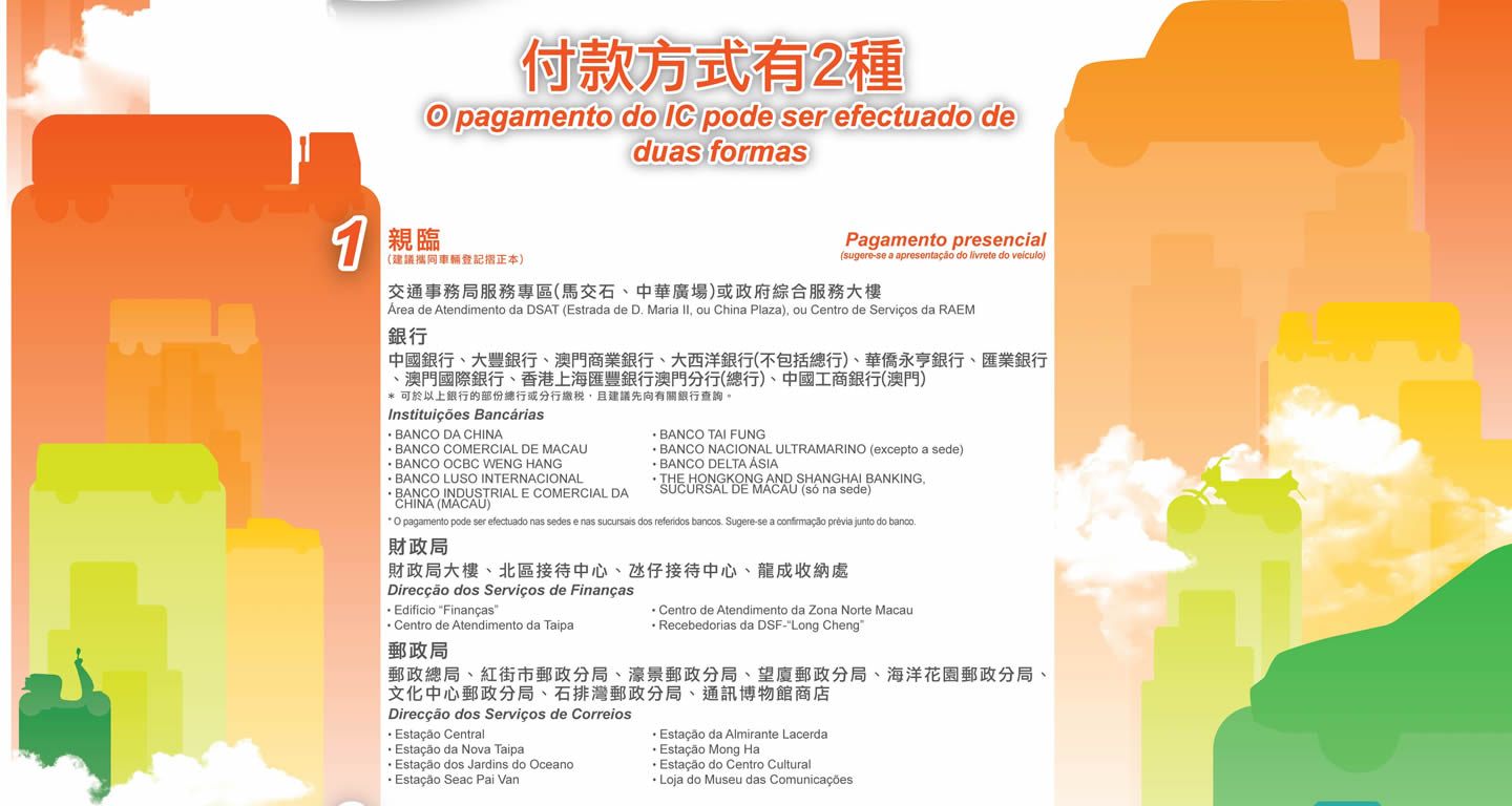 根據《車輛使用牌照稅規章》相關規定,交通事務局於2017年1月1日至3月31日徵收新一年度汽車、電單車及工業機器車的使用牌照稅。市民可前往交通事務局馬交石炮台馬路33號地下、南灣大馬路中華廣場三樓及黑沙環新街52號政府綜合服務大樓一樓I區的服務專區;財政局(包括財政局大樓、北區接待中心、氹仔接待中心及龍成收納處);指定銀行包括:中國銀行(35間分行)、大豐銀行(25間分行)、澳門商業銀行(14間分行)、大西洋銀行(18間分行,不包括總行)、華僑永亨銀行(12間分行)、匯業銀行(7間分行)、澳門國際銀行(6間分行)、香港上海匯豐銀行澳門分行(總行)、中國工商銀行(澳門)(17間分行);郵政局(包括郵政總局、紅街市郵政分局、濠景郵政分局、望廈郵政分局、海洋花園郵政分局、文化中心郵政分局、石排灣郵政分局及通訊博物館商店)繳交。