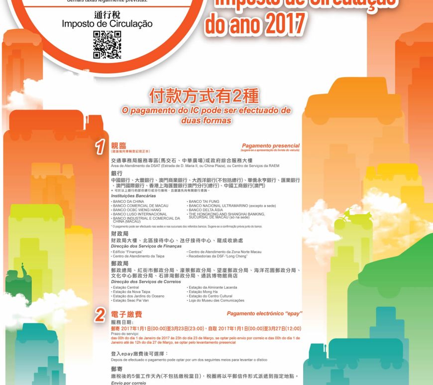 2017年度車輛使用牌照稅(即俗稱行車稅)由1月1日至3月31日期間徵收,市民可攜同車輛登記摺正本前往交通事務局服務專區、財政局大樓及接待中心、郵政總局及部分分局、本澳9間銀行130多間總行及分行繳交;或可登入https://epay.dsat.gov.mo電子繳費網站辦理繳費手續。交通事務局提醒車主,繳稅前必須先繳清交通違例罰款。