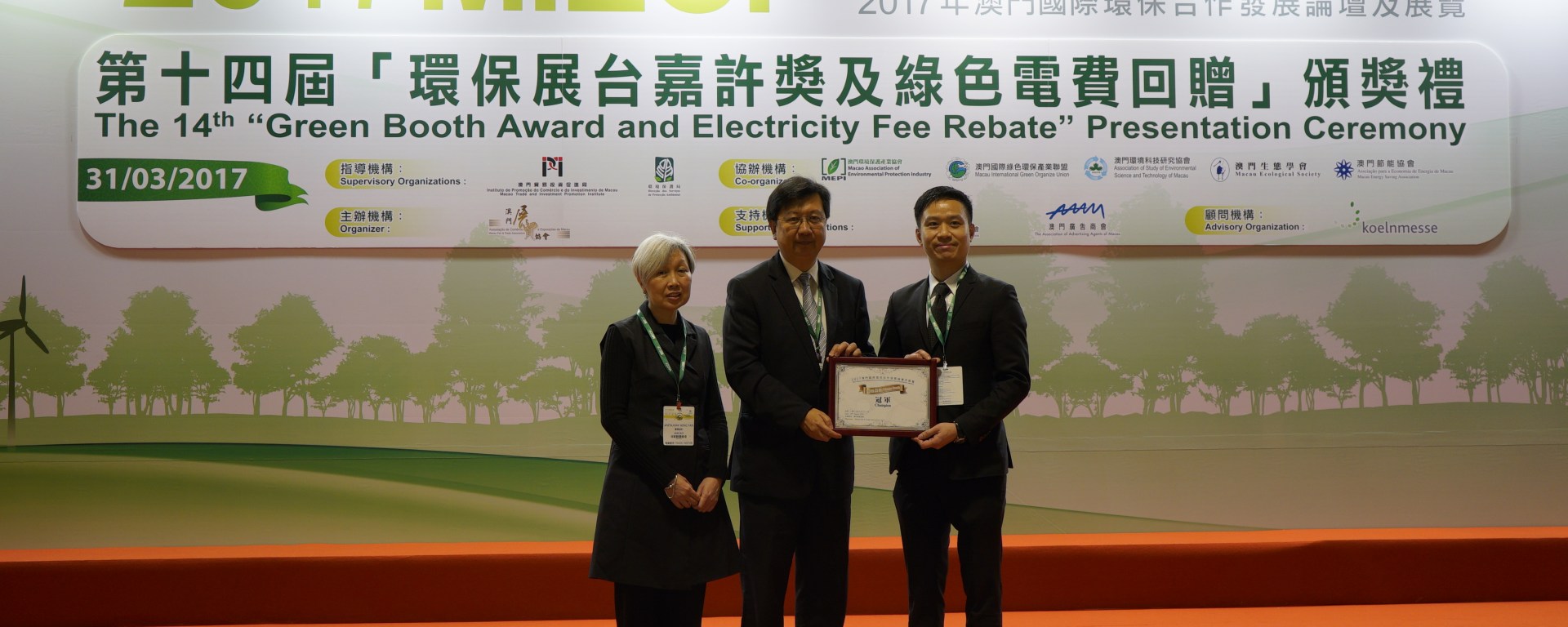 物業服務部副總裁何雄威先生(右)代表新濠博亞娛樂聯同負責展台設計及制作的意高設計創作總監麥穎茵小姐(左),從澳門環境保護局局長譚偉文(中) 手中領取奬項。新濠博亞娛樂得奬展台的設計別出心裁,使用了來自公司日常運作的回收材料,包括電腦硬碟、光碟、塑膠水樽和酒店鑰匙卡,這些都突顯了公司在回收和盡量減少其業務對環境影響方面的努力。