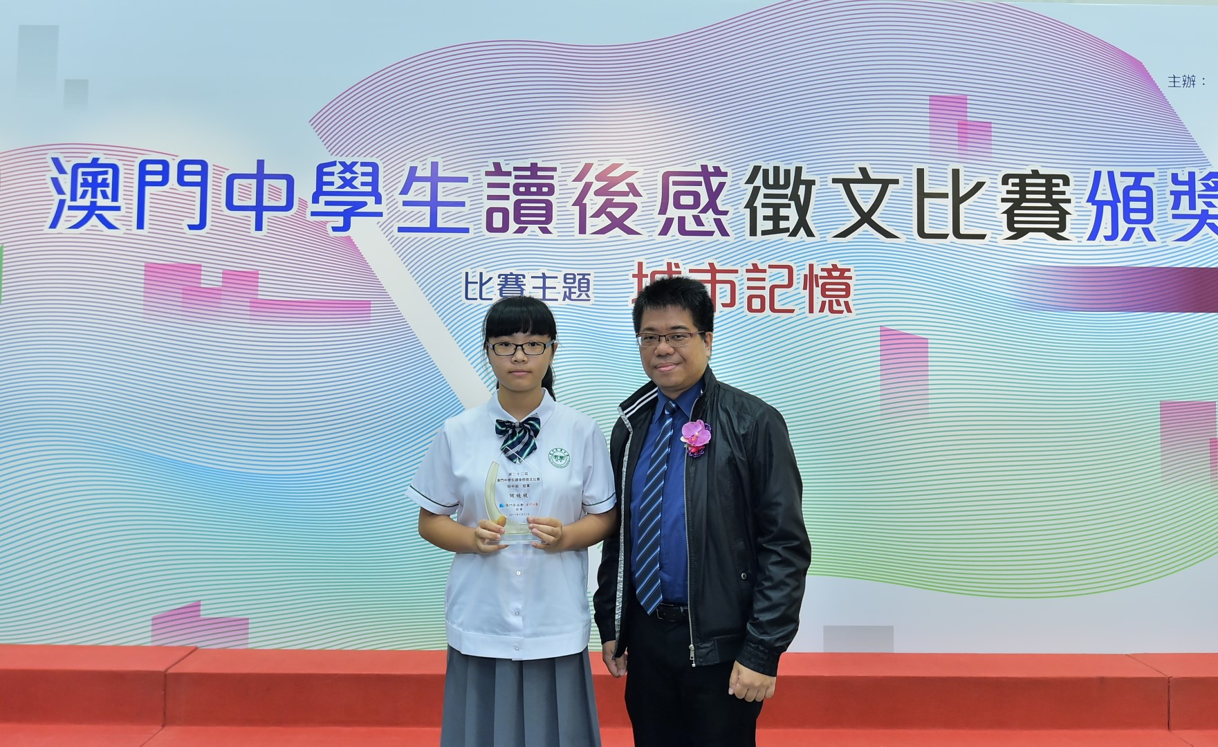 澳門日報崔志濤代總編輯向初中組冠軍何欣欣頒獎