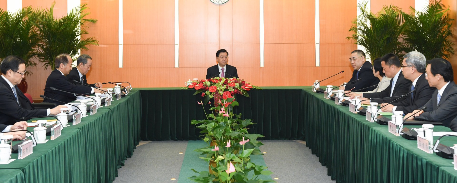 行政長官崔世安在會上首先感謝張德江委員長一直以來對澳門特區的關心與支持。他稱,在中央的關懷領導下,在澳門特區政府和廣大居民團結努力下,澳門的總體發展形勢保持良好,「一國兩制」偉大事業在澳門的實踐中繼續往前推進,祖國的繁榮穩定、發展和深化改革開放,是澳門各項事業進步的重要保障,中央制定的一系列惠澳政策措施,以及「一帶一路」、粵港澳大灣區等重大利好政策的推出和落實,為澳門新一輪發展不斷創造機遇。