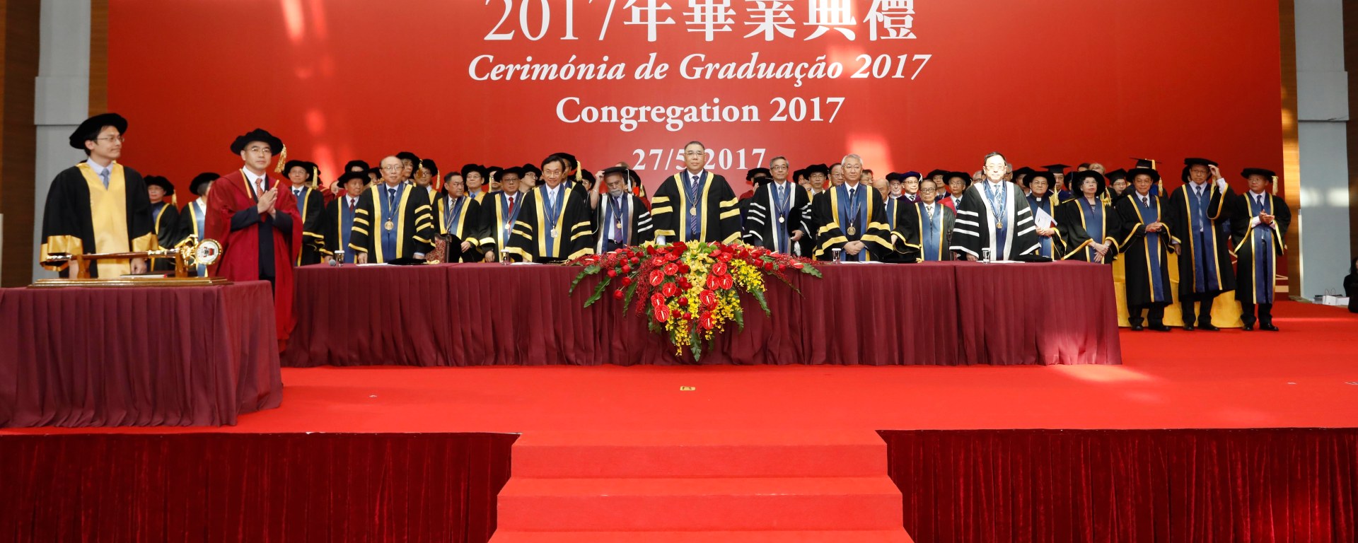 崔世安在社會文化司司長譚俊榮、澳大校董會主席林金城、校長趙偉,副校長倪明選、馬許願、程海東等陪同下主持典禮。大學議庭成員、校董會成員、教務委員會成員、政府官員、社會賢達、家長及教職員等近4千人出席見證。