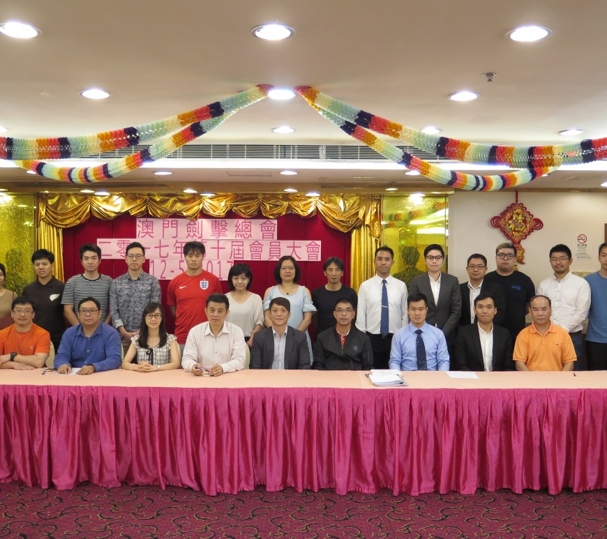 澳門劍擊總會於五月十二日在好世界酒樓舉行2017年會員大會及改選第十屆行政人員,會議並一致通過會務報告、財務報告及監事會報告,以及選出新一屆行政人員及增聘永遠榮譽會長、榮譽會長、名譽會長。麥炳耀與陳宇川接任會長及理事長,兩人勉勵新一屆行政人員再接再厲,秉承創會宗旨,薪火相傳,為推動澳門劍擊運動多作貢獻。