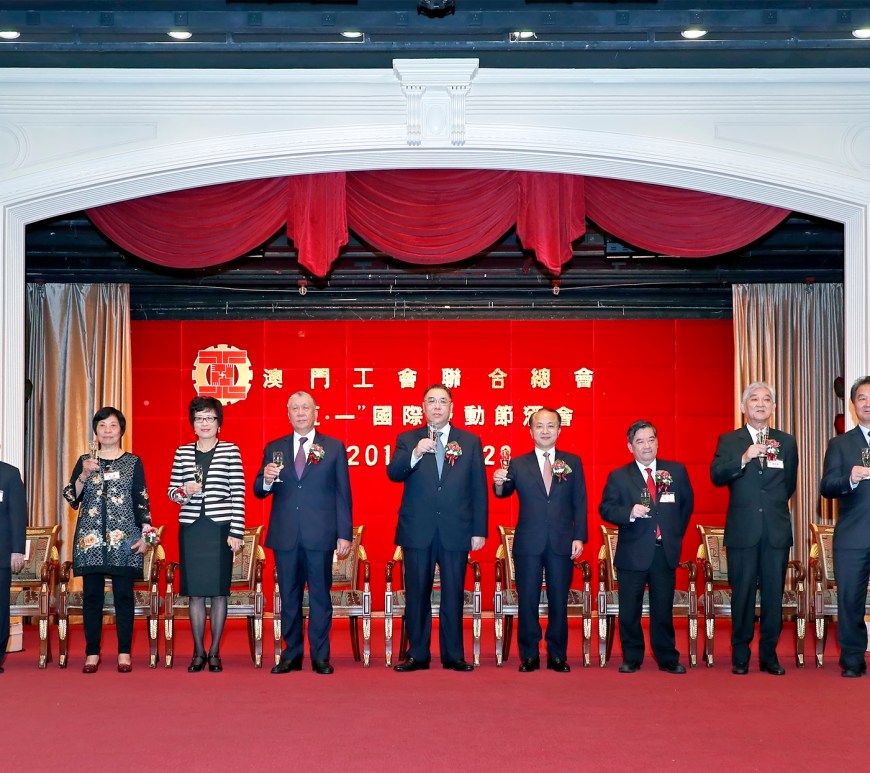 澳門工會聯合總會於4月28日舉行慶祝五一國際勞動節酒會,行政長官崔世安、全國政協副主席何厚鏵、中聯辦主任王志民、外交部駐澳特派員公署副特派員王冬、立法會代主席林香生,在工聯會務顧問潘玉蘭、劉焯華、潘漢榮,會長陳錦鳴、理事長梁偉峰、監事長梁玉華等陪同下主禮。