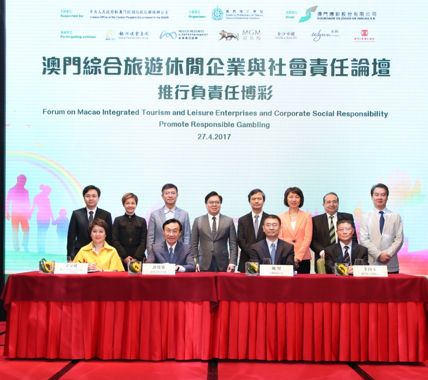 由澳門理工學院主辦、中央人民政府駐澳門特別行政區聯絡辦公室支持、澳門博彩股份有限公司承辦,“澳門綜合旅遊休閒企業與社會責任論壇” 4月27日下午三時於新葡京宴會廳舉行,論壇主題為“推行負責任博彩”。參與論壇並發言單位(按發言順序)為澳門博彩股份有限公司、美高梅、永利澳門有限公司、金沙中國有限公司、新濠博亞娛樂、銀河娛樂集團、澳門工會聯合總會和澳門理工學院。論壇目標為促進業界、居民和訪澳旅客更全面了解本澳綜合旅遊休閒企業在推動負責任博彩方面的工作和成效。