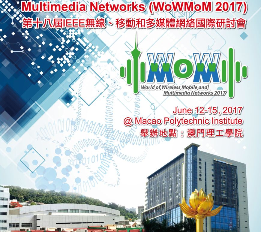第十八屆「IEEE 無線、移動和多媒體網絡國際研討會」(World of Wireless, Mobile and Multimedia Networks, WoWMoM)於6月12至15日於澳門理工學院隆重舉行,研討會由澳門理工學院、國際電機電子工程師學會(IEEE)及IEEE 計算機學會、IEEE 計算機通信技術委員會、英國倫敦大學瑪麗皇后學院及美國密蘇里州科技大學共同主辦。百多名世界各地著名專家學者匯聚澳門,共同探討世界科技及學術前沿發展,涵蓋無線通訊、物聯網、大數據及智慧城市領域的多個技術層面,議題包括高效能多媒體網絡、下一代網絡、無線網絡分析及優化、情景感知、可穿戴技術與社交網絡、本地化與跟蹤技術、數據分析與機器學習、移動數據分流、多媒體系統優化,以及資源管理與隨需配置等領域。