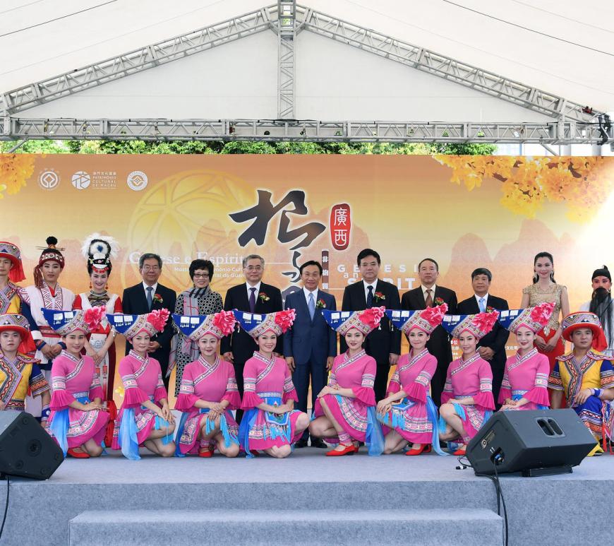 化遺產保護領域的合作和交流,並讓澳門市民更好地認識祖國深厚的文化底蘊及豐富的非物質文化遺產,由國家文化部與澳門特別行政區政府社會文化司主辦、澳門特別行政區政府文化局與廣西壯族自治區文化廳承辦的《根與魂─廣西非物質文化遺產展演》,於六月八日(星期四)下午五時在議事亭前地舉行盛大的開幕式。澳門特別行政區政府社會文化司司長譚俊榮、國家文化部副部長項兆倫、中央人民政府駐澳門特別行政區聯絡辦公室副主任薛曉峰、外交部駐澳門特別行政區特派員公署副特派員王冬、國家文化部港澳台辦公室副主任李健鋼、澳門特別行政區政府文化局局長梁曉鳴及廣西壯族自治區文化廳副廳長朱創偉出席主禮。 廣西壯族自治區風光旖旎、民族風情濃郁,其深厚的歷史底蘊和絢麗的民族傳統文化孕育出豐富的非物質文化遺產。廣西現有人類非物質文化遺產代表作一項,國家級非遺代表性項目五十項,自治區級非遺代表性項目五百八十三項。是次系列活動將為本澳市民展示具地方特色的傳統工藝,包括繡球、蠟染、六堡茶、馬尾繡等製作工藝,並透過精彩的舞台演出向觀眾展現桂劇、馬骨胡藝術、壯族歌圩習俗等多項廣西的非遺項目,機會難逢。