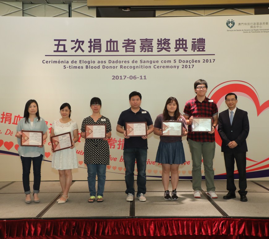 衛生局6月11日舉行了2017年「世界捐血者日」活動系列之一的「五次捐血者嘉奬典禮」。是次嘉奬典禮邀請的對象是2016年度捐血達5次的捐血者出席,合資格的捐血者共有738人,今日出席的人數共逾300人。衛生局鄭成業副局長、李偉成代副局長及捐血中心許萍主任向出席的捐血者頒發「五次捐血嘉奬證書」。