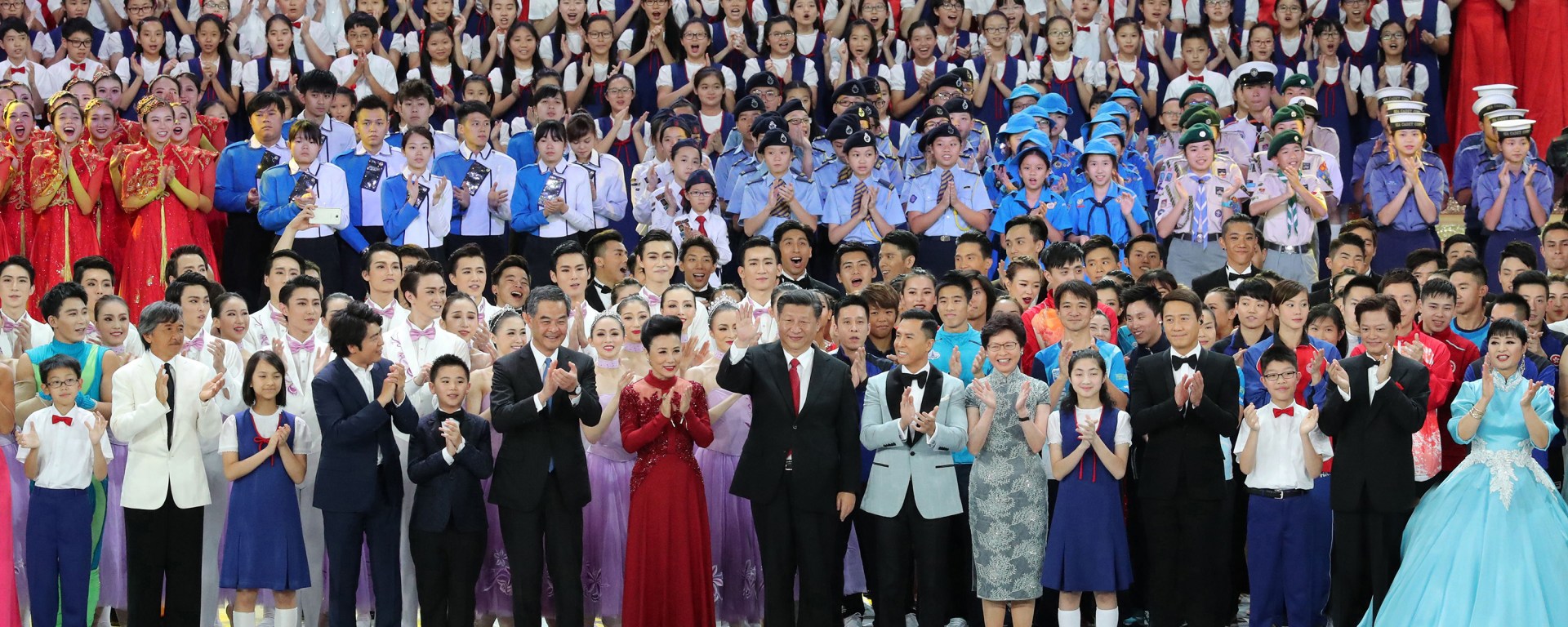 中共中央總書記、國家主席、中央軍委主席習近平和夫人彭麗媛在香港特別行政區行政長官梁振英和夫人梁唐青儀陪同下,步入晚會現場。全場觀眾起立長時間鼓掌,熱烈歡迎習近平的到來。