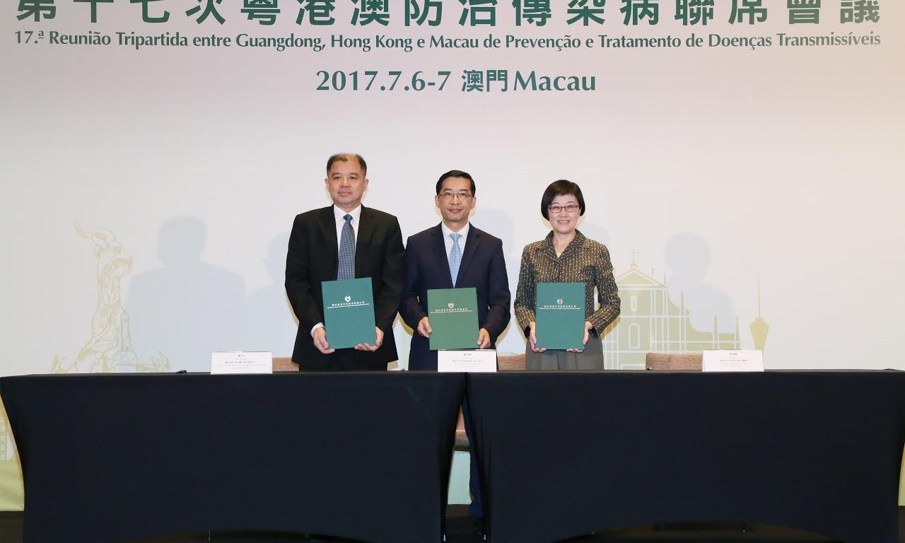 由衛生局舉辦的「第十七次粵港澳防治傳染病聯席會議」於 7月6至 7日一連兩天在澳門舉行,衛生局鄭成業代局長、廣東省衛生和計劃生育委員會陳祝生副主任和香港衛生署陳漢儀署長分別率團出席會議。三地專家共約62名。