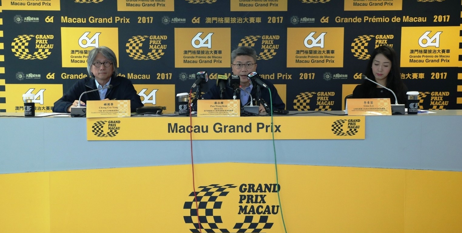 澳門特別行政區政府體育局局長及澳門格蘭披治大賽車組織委員會協調員潘永權、中國-澳門汽車總會理事長鍾國榮、冠名贊助商太陽城集團公共及社會關係部高級副總裁李素茵等出席新聞發佈會,會見傳媒。