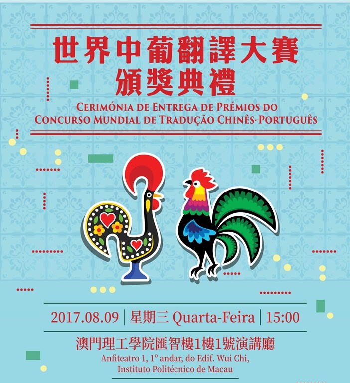 《世界中葡翻譯大賽》頒獎禮於八月九日下午三時正於理工匯智樓一樓一號演講廳舉行,歡迎各大專院校專家學者、師生及有興趣人士參與。詳情請瀏覽比賽網頁:www.ipm.edu.mo/WCPTC或致電8599 3281與主辦單位聯絡。