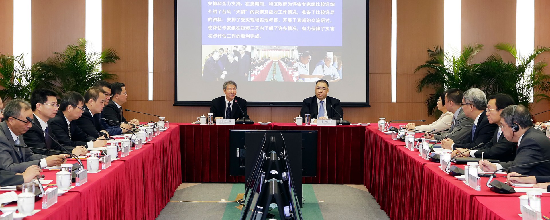 在聽取初步匯報後,行政長官感謝國家減災委員會專家團隊在短短幾天時間內不辭勞苦,聽取部門報告和實地考察,並且高效、專業地總結了初步報告。他認為,報告既有對特區政府工作的肯定,也對部分工作提出了改善的意見及建議,內容充實且具有指導性,值得特區政府各部門認真學習、積極落實和加以改善。政府會從全域出發,以整個特區的利益為依歸,盡力回應社會對特區政府的要求。