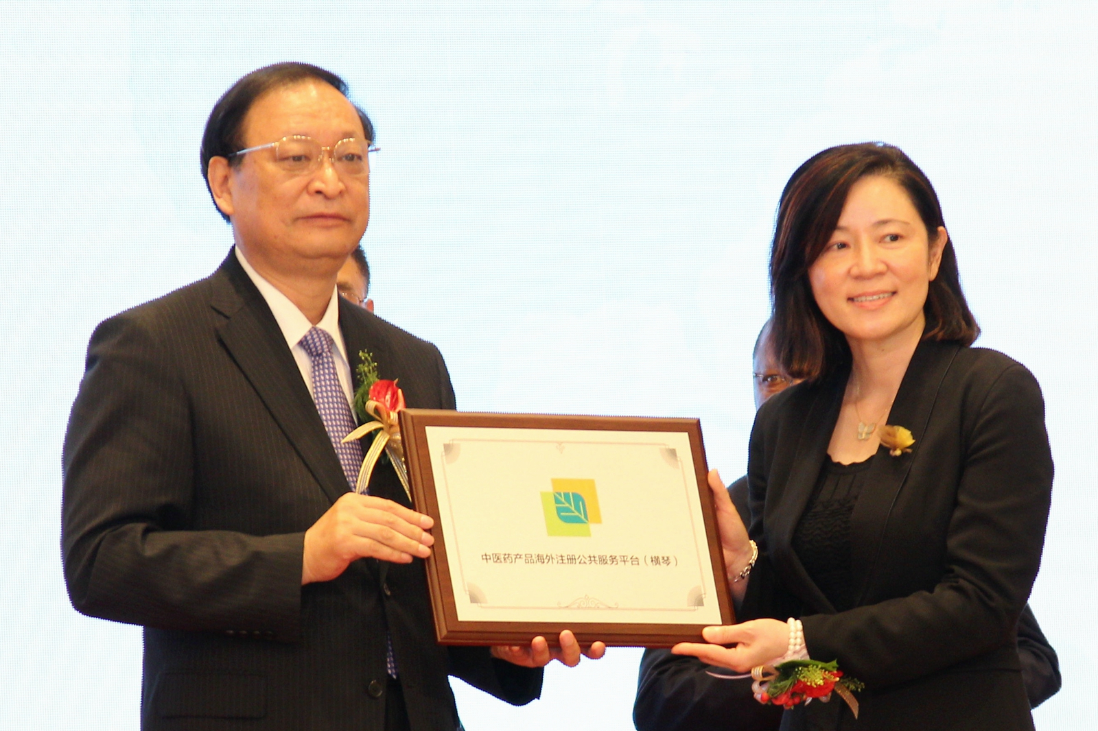 王國强局長向産業園頒授“中醫藥産品海外注册公共服務平臺(橫琴)”牌匾,並由呂紅董事長代表受領