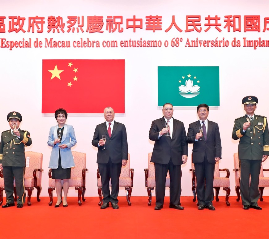 特區政府於10月1日舉行慶祝68周年國慶酒會,行政長官崔世安致辭時表示,祖國的繁榮富強永遠是澳門穩定發展的強大後盾,早前本澳受災期間,祖國亦給予了大力支持和溫暖關懷;澳門必須配合國家發展戰略的需要,在促進自身繁榮進步的同時,為國家的發展做出貢獻。