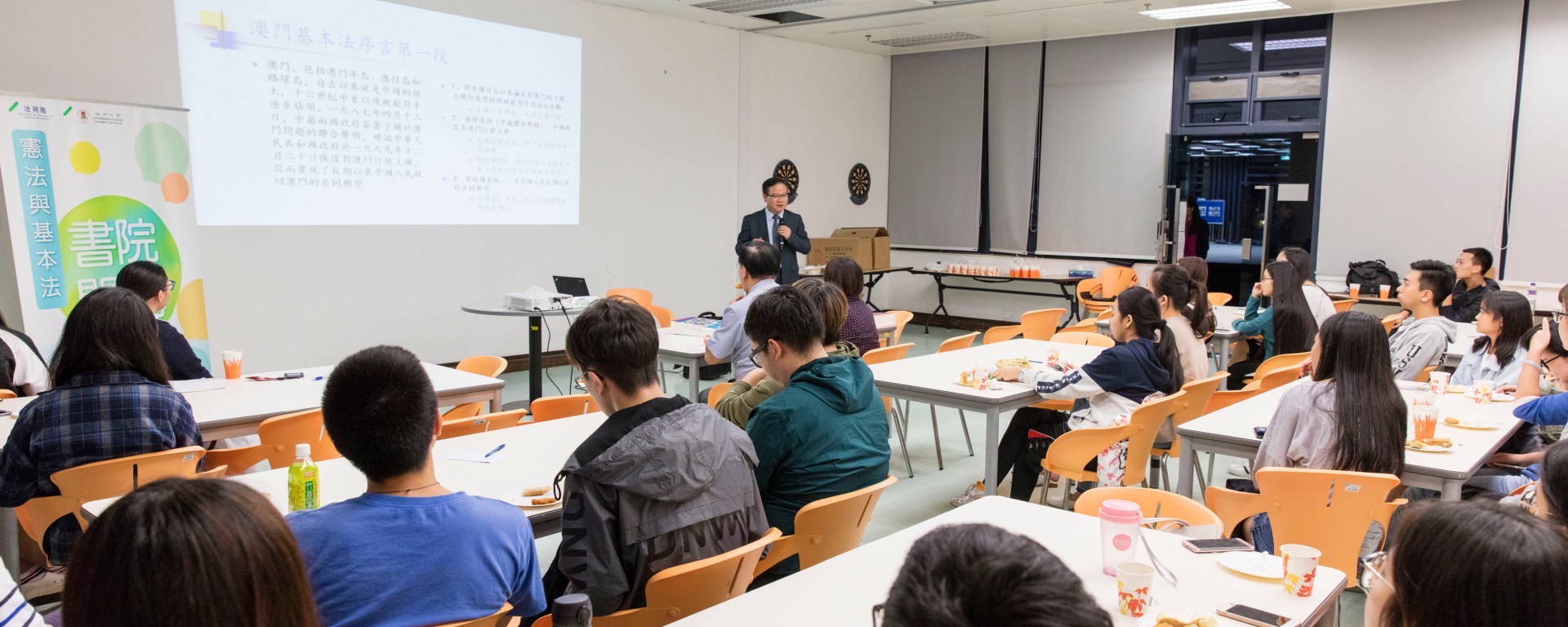 為向青少年推廣國家憲法與基本法,法務局與澳門大學今年再次合辦憲法與基本法推廣活動,分別與澳門大學呂志和書院及曹光彪書院合辦「書院開講-趣談基本法」講座,邀請澳門大學法學院蔣朝陽副教授擔任主講嘉賓,透過日常生活例子講解憲法與基本法的重要性及關係,並就學生感興趣的議題即場交流討論,兩場活動合共約一百三十位書院學生參加,反應熱烈。