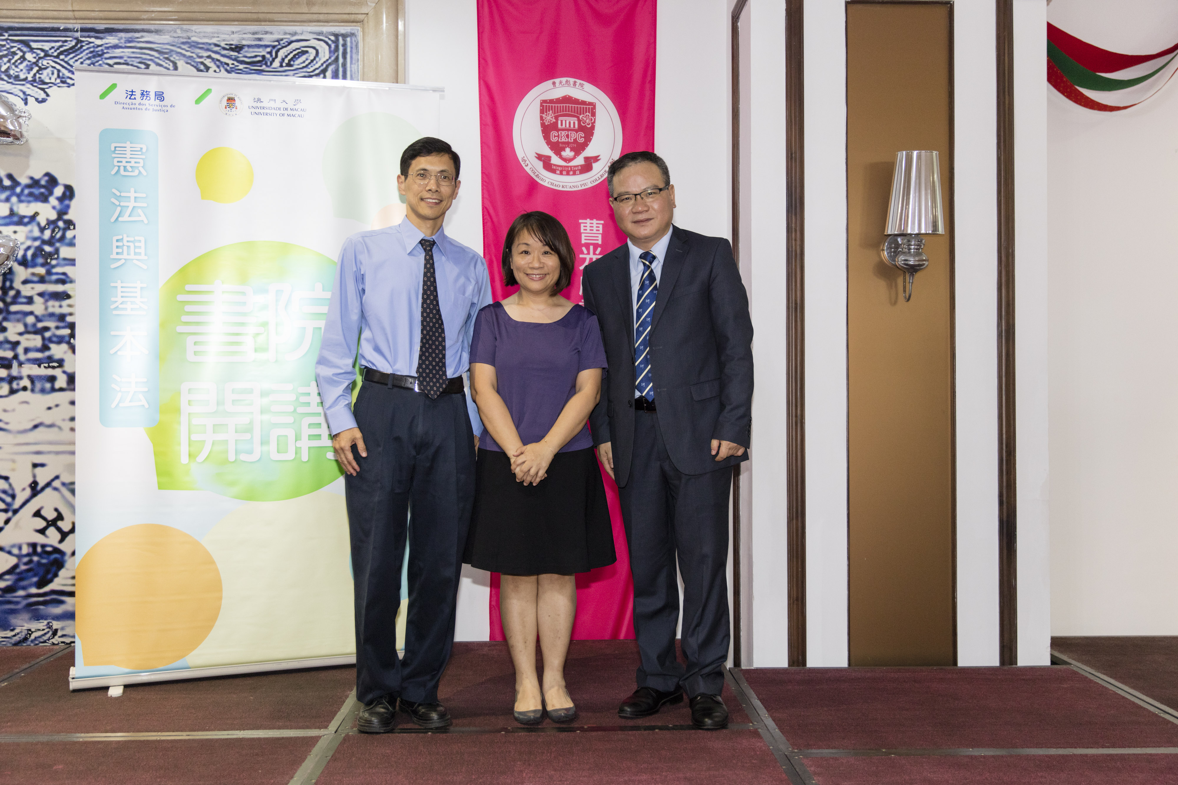 (左起)澳門大學曹光彪書院院長劉潤東博士、法務局法律推廣及公共關係廳廳長羅靜萍、澳門大學法學院蔣朝陽副教授合影。