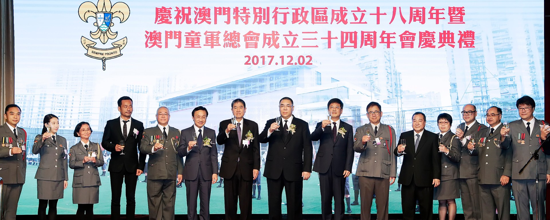 澳門童軍總會十二月二日在萬豪軒舉行慶祝澳門特別行政區成立十八周年暨該會成立三十四周年典禮,行政長官、澳門童軍總領袖崔世安伉儷,中聯辦主任鄭曉松,社會文化司司長、澳門童軍副總領袖譚俊榮等嘉賓主禮,教育暨青年局局長老栢生致詞祝賀及勉勵。會長馬有恆希望全體童軍再接再厲,繼續切實履行童軍精神、凝聚各方青年力量,為祖國的繁榮進步,為澳門創造美好的明天共同努力奮鬥。