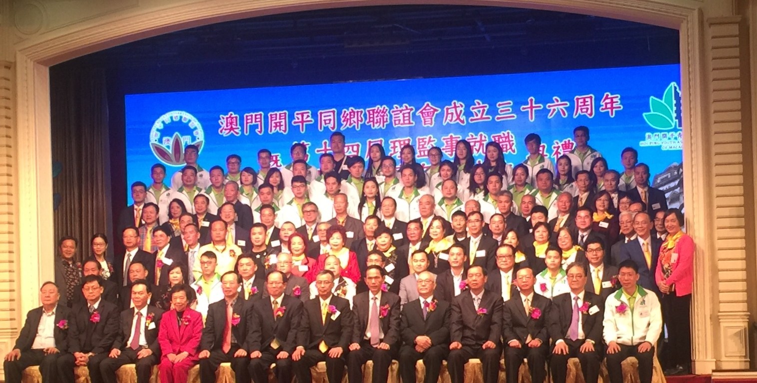 澳門開平同鄉聯誼會於十一月廿七日晚上假萬豪軒酒家設宴,慶祝成立卅六周年暨舉行第十四屆理監事會就職典禮。會長余焯源鼓勵新一屆理監事成員緊跟形勢,團結會員,開展會務工作,並為中華民族偉大復興貢獻力量。而澳門開平青年會的成立,會長方煥興承諾竭力為本地開平籍青年,為澳門與家鄉開平市搭建經貿、文化交流、友誼橋樑。
