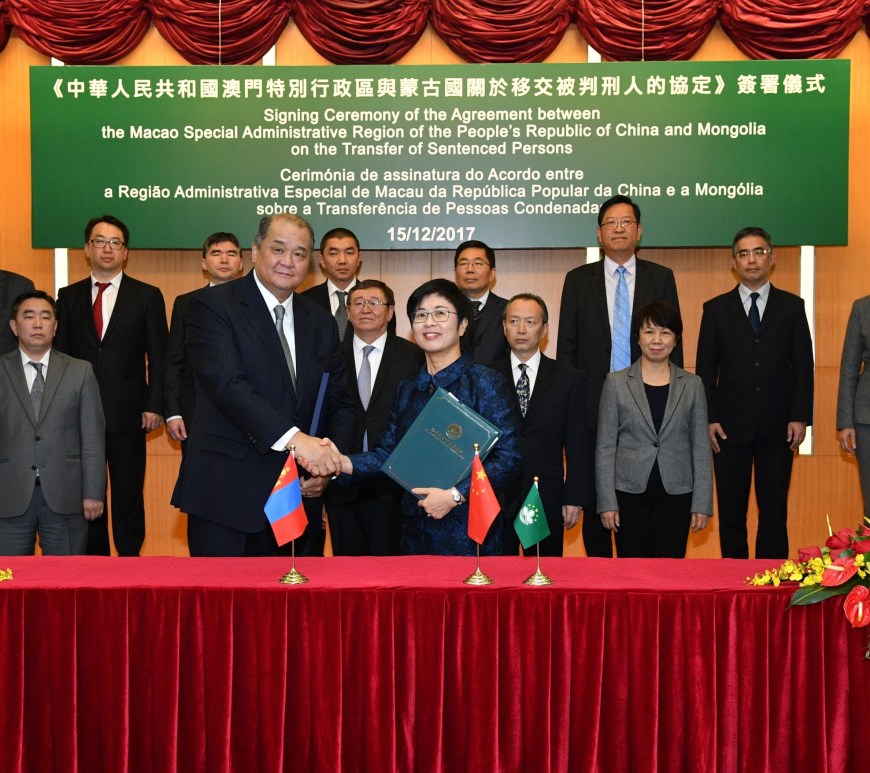 12月15日下午3時半,在澳門特別行政區政府總部,行政法務司陳海帆司長和蒙古國駐港總領事館Samdan Erdene總領事分別代表中華人民共和國澳門特別行政區與蒙古國簽署《中華人民共和國澳門特別行政區與蒙古國關於移交被判刑人的協定》。上述協定的簽署標誌著有關磋商工作已取得圓滿成果。