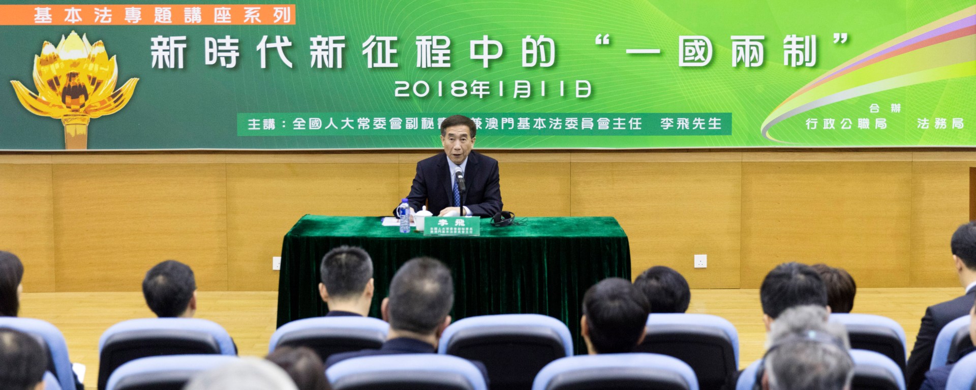 為積極推動公務人員對基本法的了解,法務局聯同行政公職局合辦專題講座,邀請全國人大常委會副秘書長兼澳門基本法委員會主任李飛先生主講,講座主題為「新時代新征程中的『一國兩制』」。通過講座為公務人員分析有關問題的核心內容,提升他們對基本法與「一國兩制」的全面準確掌握。