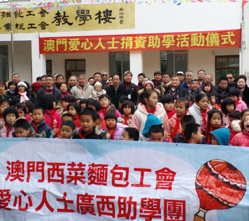 由李永強、梁全、張錦華、張耀宗、梁子衡、董發揚、蘇偉良、李秋璋、陳鍵銓與各界好友組成的「澳門西菜麵包工會愛心人士廣西助學團」在顧問莫育敏陪同下,一行五十餘人於本月八日前往廣西容縣楊梅鎮四美小學,進行一年一度助學活動。希望藉此鼓勵學生努力學習,傳承中華文化,長大做一個對國家對社會有貢獻的人,