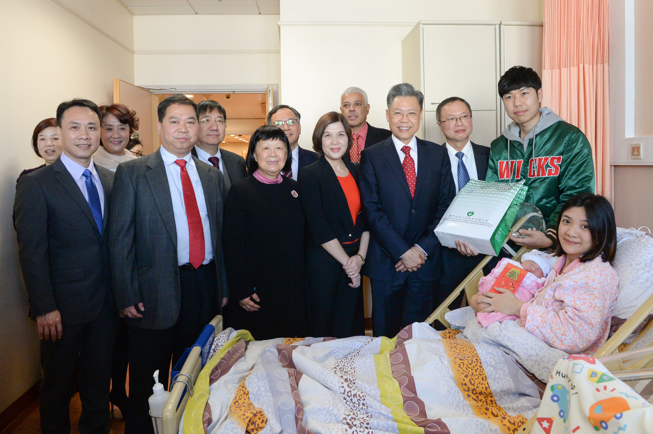 衛生局副局長、仁伯爵綜合醫院院長郭昌宇探望狗年首位在鏡湖醫院出生的嬰兒,並贈送禮物。