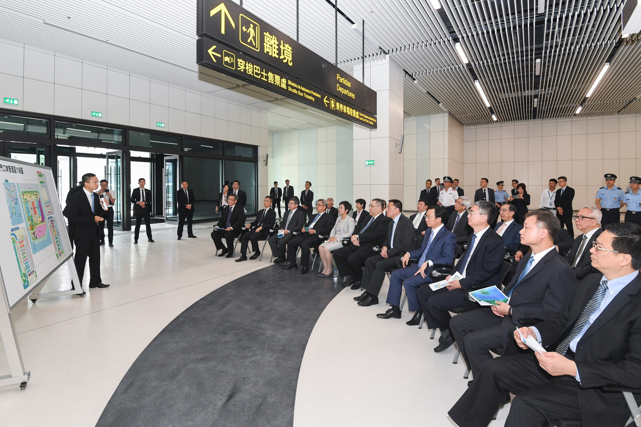 行政長官崔世安在旅檢大樓聽取交通事務局局長林衍新介紹澳門口岸管理區連接澳門半島的交通安排、前往香港和珠海的交通規劃和配套設施
