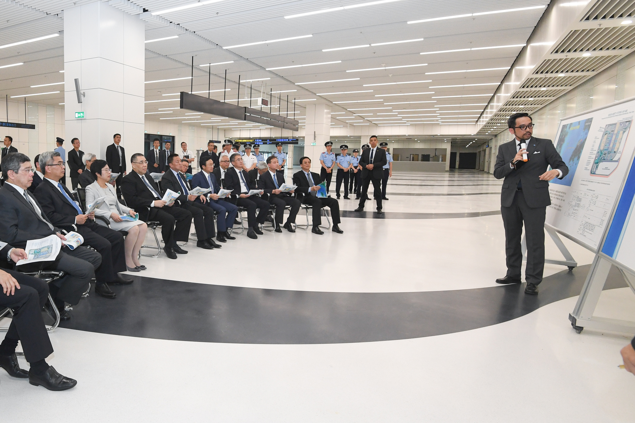 行政長官崔世安視察澳門口岸管理區旅檢大樓,聽取建設發展辦公室代主任馬文俊介紹澳門口岸管理區的整體建設規劃和佈局。