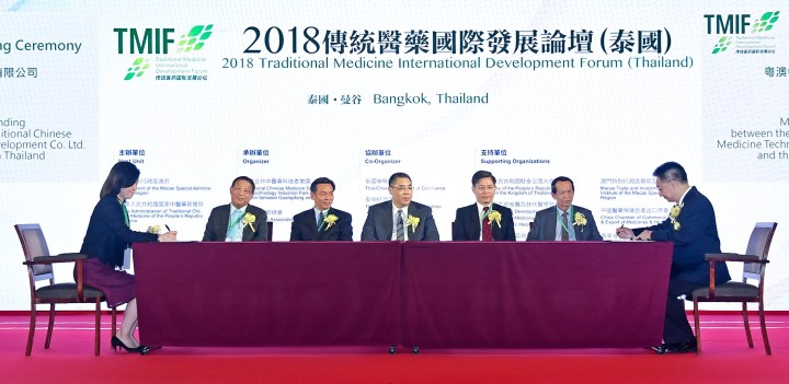 2018傳統醫藥國際發展論壇(泰國)由中國國家中醫藥管理局和澳門特區政府共同主辦,泰國衛生部大力支持。行政長官崔世安、國家中醫藥管理局副局長閆樹江、中國駐泰國特命全權大使呂健及泰國衛生部部長代表、泰醫及替代醫學發展司司長Kiattibhoom Vongrachit出席了論壇開幕式,並先後致辭。