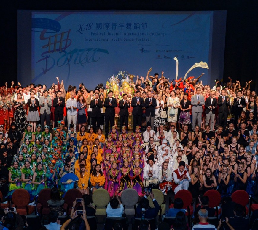 「一帶一路.全城舞動」國際青年舞蹈節2018由教育暨青年局主辦,民政總署、文化局、旅遊局、體育局、旅遊學院、澳門理工學院及亞洲教育北京論壇協辦。為積極配合國家「一帶一路」的建設倡議,今屆國際青年舞蹈節特別以「一帶一路.全城舞動」為主題,為來自世界各地的青年舞蹈員提供以舞會友的平台,透過肢體語言進行溝通,達至民心相通。7月26日晚上超過550名來自世界各地及澳門的青年舞蹈員於歡聚綜藝館綜藝一館傾力演出,為今屆舞蹈節劃上完美的句號。社會文化司司長譚俊榮、中央人民政府駐澳門特別行政區聯絡辦公室副主任薛曉峰、教青局局長老柏生、中國人民解放軍駐澳門部隊政治工作部處長溫志中上校、亞洲教育北京論壇秘書長姚望、比利時駐香港總領事Michele Deneffe女士、以色列駐香港總領事Ahuva Spieler女士及其配偶、俄羅斯駐香港副總領事Nina Narutdinova女士、中央人民政府駐澳門特別行政區聯絡辦公室教育與青年工作部部長徐婷、社會文化司司長辦公室顧問惠程勇、教青局副局長龔志明、體育局副局長劉楚遠、文化局副局長楊子健、旅遊局副局長許耀明、國家教育部體育衛生與藝術教育司副處長陳蓓蓓等嘉賓出席欣賞了當晚的演出,並與全體舞蹈員合照留念,氣氛熱烈溫馨。