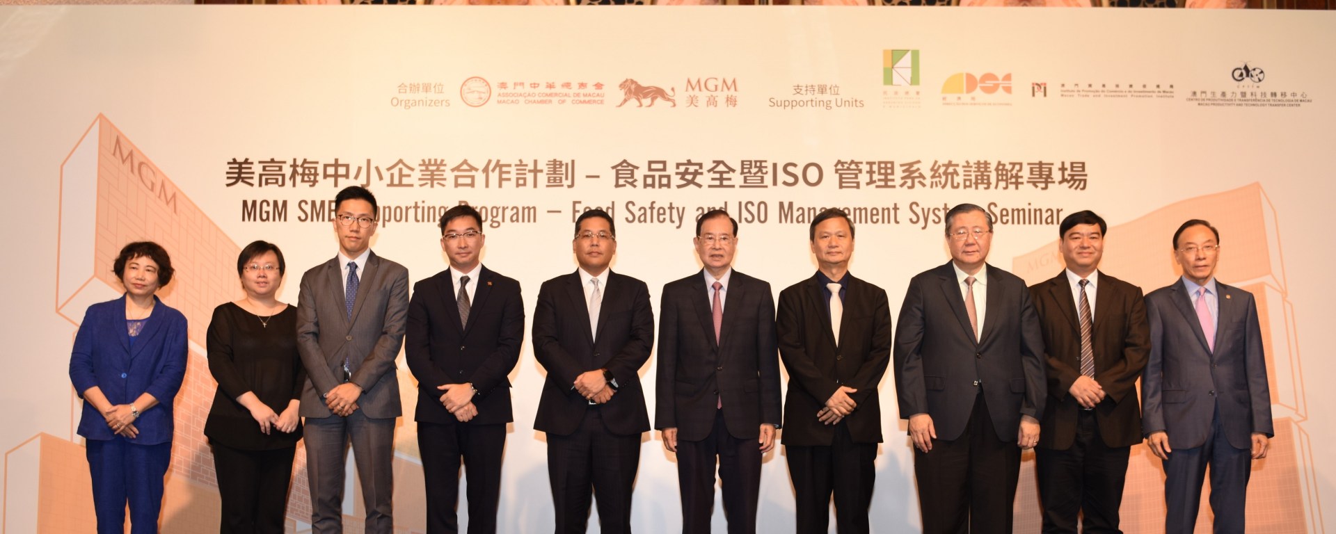 美高梅與中總深明扶持本地中小企,並提升其競爭力至國際水平,對澳門經濟適度多元發展至關重要。是次講解專場旨在提升本地中小企對食品安全及ISO管理系統的瞭解,協助其改善管理和服務質素,從而促進中小企的成長及本澳餐飲行業的整體發展。主禮嘉賓包括:澳門中華總商會崔煜林副理事長、博彩監察協調局梁文潤副局長、貿易投資促進局行政管理委員會黃偉倫執行委員、民政總署食品安全中心張桂達部長、經濟局產業發展廳邱潤華廳長、生產力暨科技轉移中心孫家雄理事長、生產力暨科技轉移中心標準、管理及培訓考試部李藹倫高級經理,以及美高梅採購及供應服務鄭忠勇副總裁。