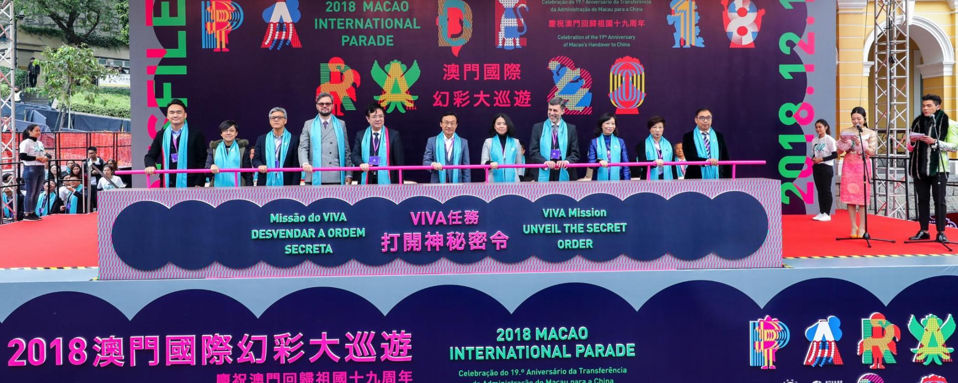澳門社會文化司司長譚俊榮、中央人民政府駐澳門特別行政區聯絡辦公室副主任薛曉峰、馬來西亞駐香港總領事館副總領事Grace Rebekah Teh、巴西駐香港總領事館副總領事Rafael Rodrigues Paulino、葡萄牙駐澳門及香港總領事館代表Joaquim Coelho Ramos、澳門社會文化司司長辦公室主任葉炳權、澳門特別行政區政府文化局局長穆欣欣、澳門旅遊局局長文綺華、澳門體育局代局長林蓮嬌、澳門教育暨青年局副局長龔志明、澳門消防局副局長鄒家昌主持大巡遊開幕式。