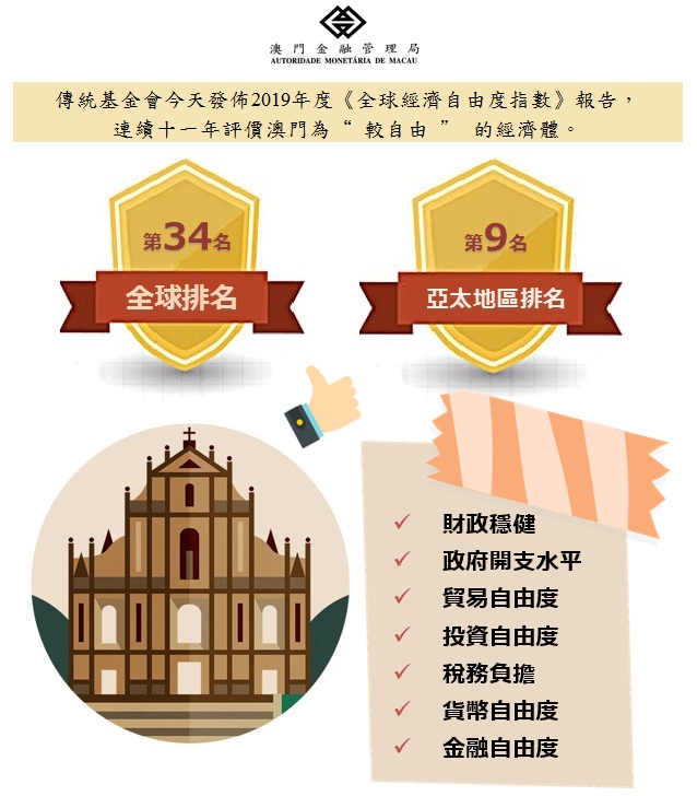 傳統基金會日前發佈2019年度《全球經濟自由度指數》報告,連續十一年評價澳門為「較自由」的經濟體。澳門的總體經濟自由度評分為71.0,較2018年度的70.9為高,並明顯高於世界及區內的平均水平,在全球180個經濟體中排名第34位。在亞太地區43個經濟體中,澳門排名第9,僅次於香港、新加坡、新西蘭、澳洲、台灣地區、馬來西亞、韓國及日本。