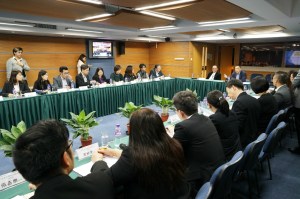 經濟財政司司長梁維特,生產力暨科技轉移中心理事會主席楊俊文與中心各部門同事交流工作意見。
