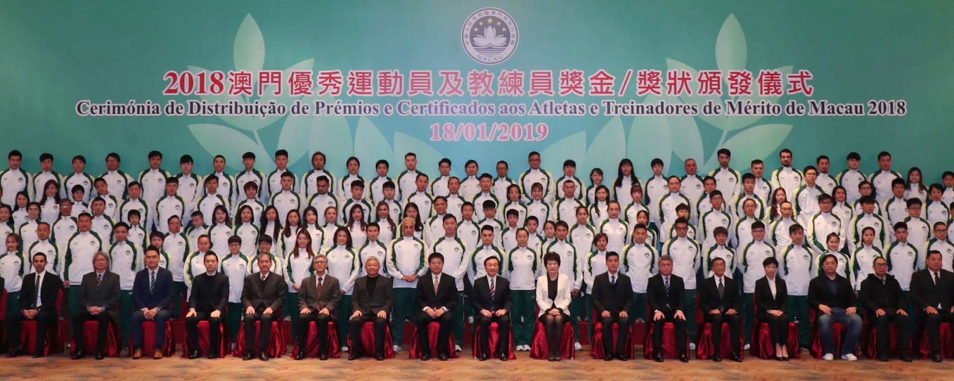 為表彰在2018年度參加體育比賽中獲得優秀成績的運動員及教練員,「2018澳門優秀運動員及教練員獎金/獎狀頒發儀式」於1月18日晚上7時半於漁人碼頭會議展覽中心舉行,社會文化司司長譚俊榮等出席了頒發儀式,並祝賀獲獎的隊伍。