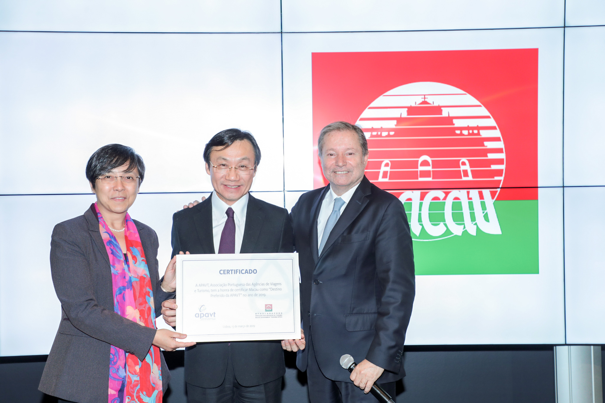 旅遊局局長文綺華代表澳門接受葡萄牙旅行社協會頒發的2019年理想旅遊目的地證書